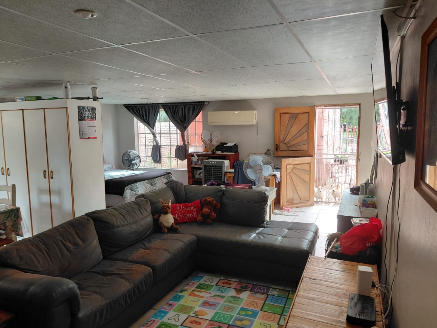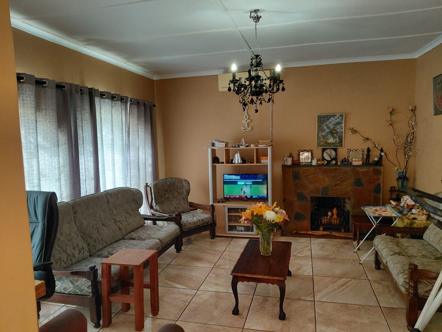The interior features two distinct lounge areas. A functional kitchen serves the home, complemented by a dedicated braai room, Practical amenities include a dedicated laundry area and air conditioning for year-round comfort.