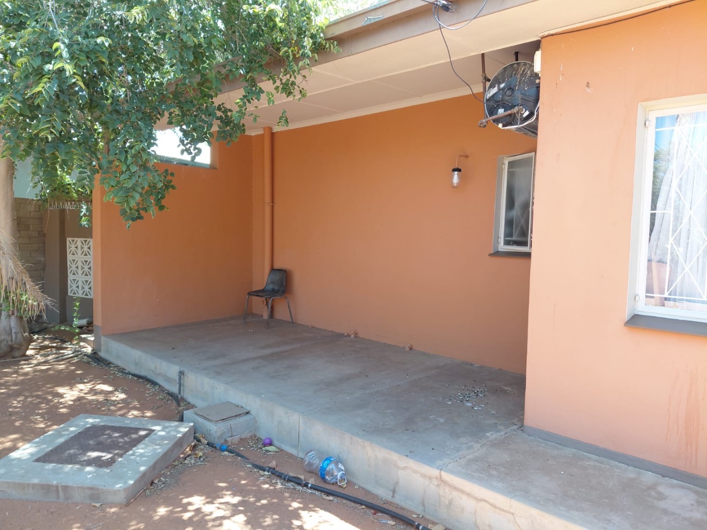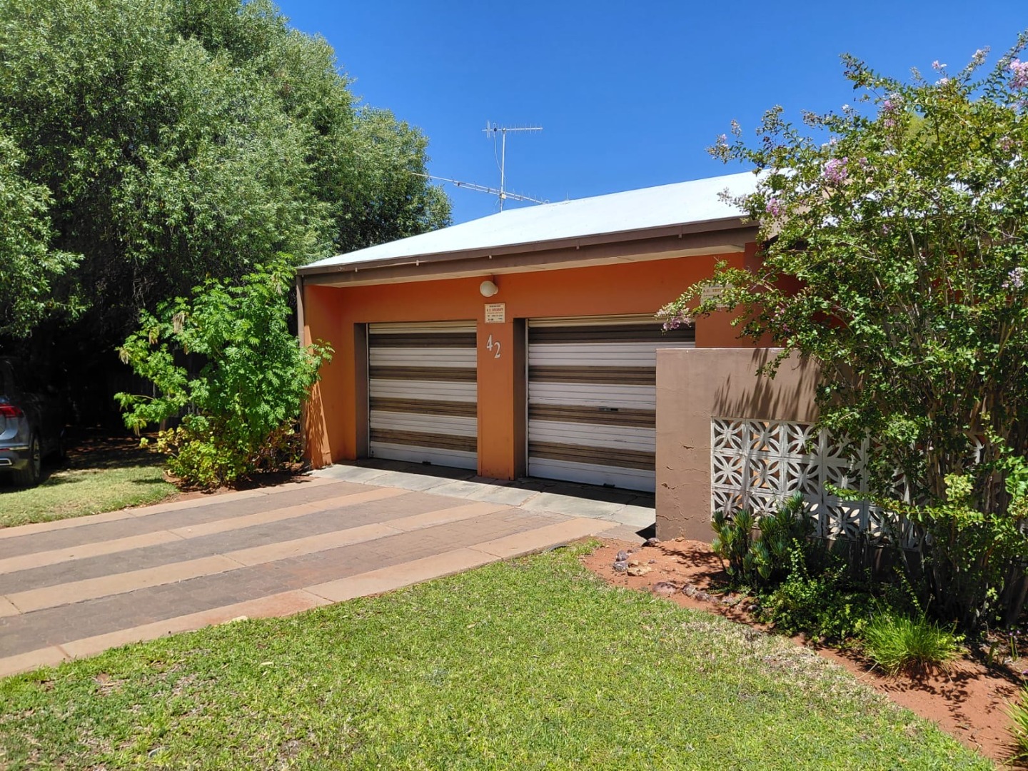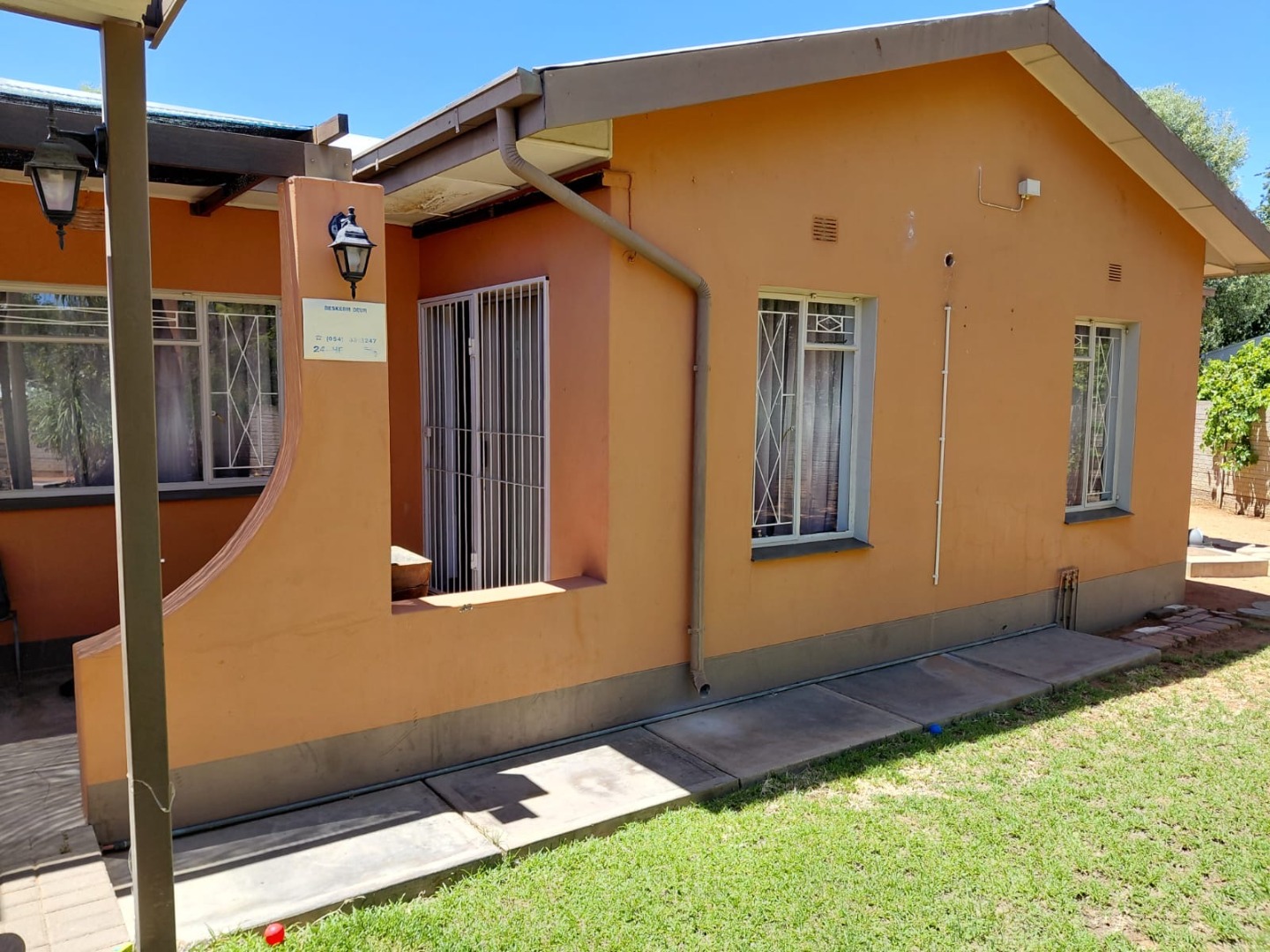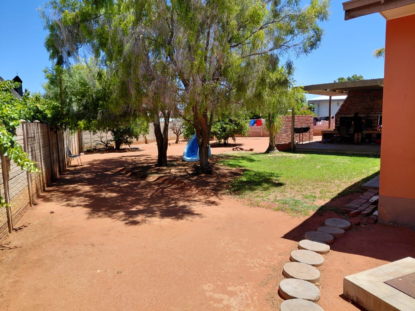 Discover this charming 4-bedroom, 2-bathroom family home located in the established suburb of Oosterville, Upington, South Africa. Presenting a welcoming kerb appeal, the single-story residence features an attractive orange/terra cotta facade, complemented by a lawn and mature trees that provide natural shade. A paved driveway leads to a convenient double garage, ensuring ample parking and storage.