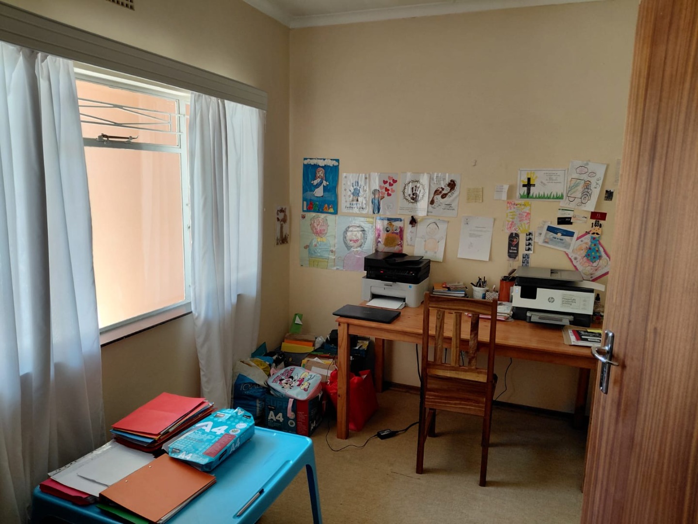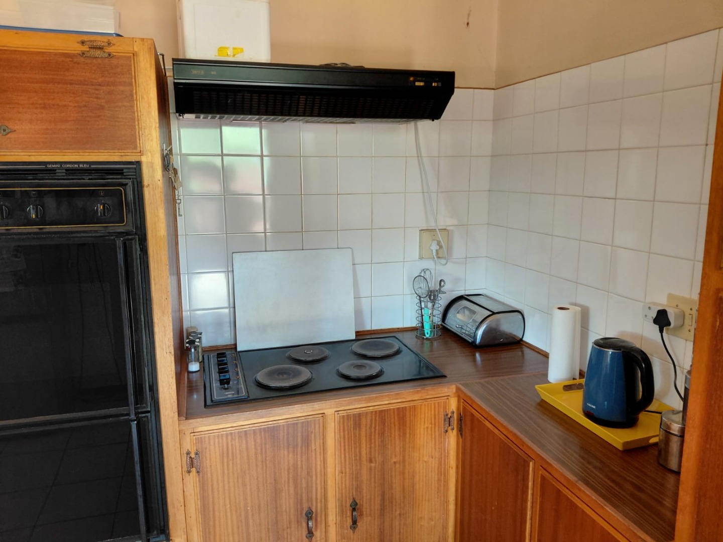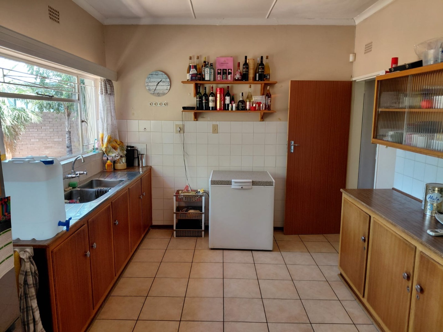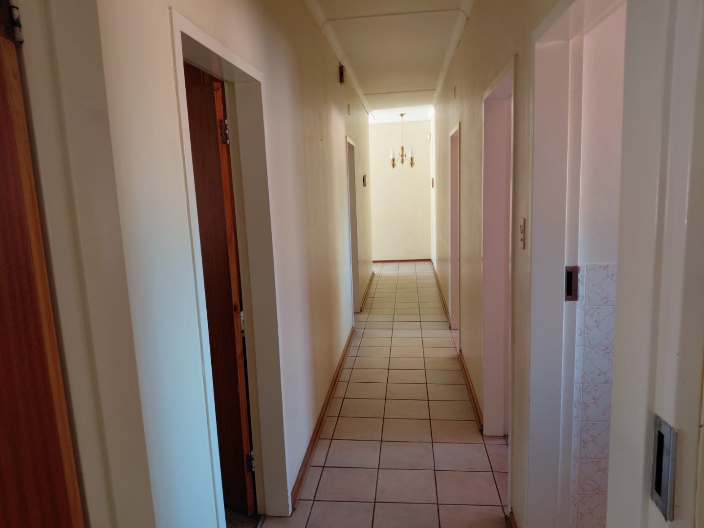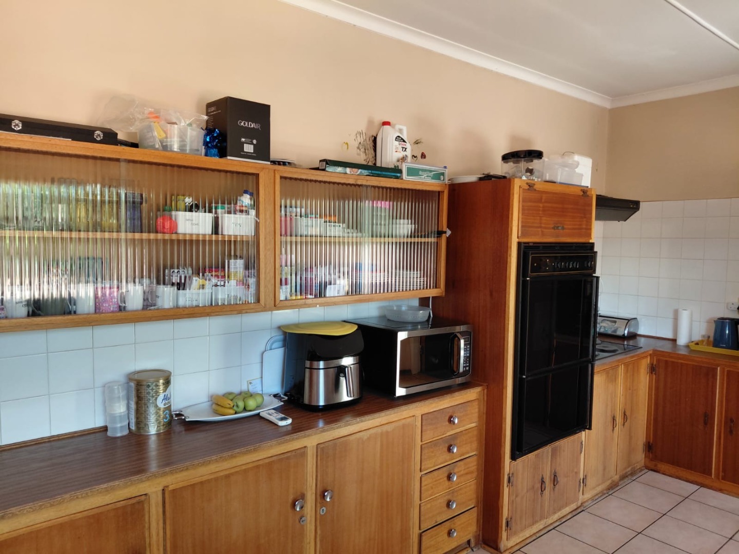 The functional kitchen is equipped with extensive wooden cabinetry, a built-in double oven, and generous countertop space, all complemented by easy-to-clean tiled surfaces. This practical space caters to all your culinary needs. The home further comprises four comfortable bedrooms and two well-appointed bathrooms, providing ample accommodation for a growing family. A central hallway with tiled flooring connects the various rooms, ensuring seamless movement throughout the home.