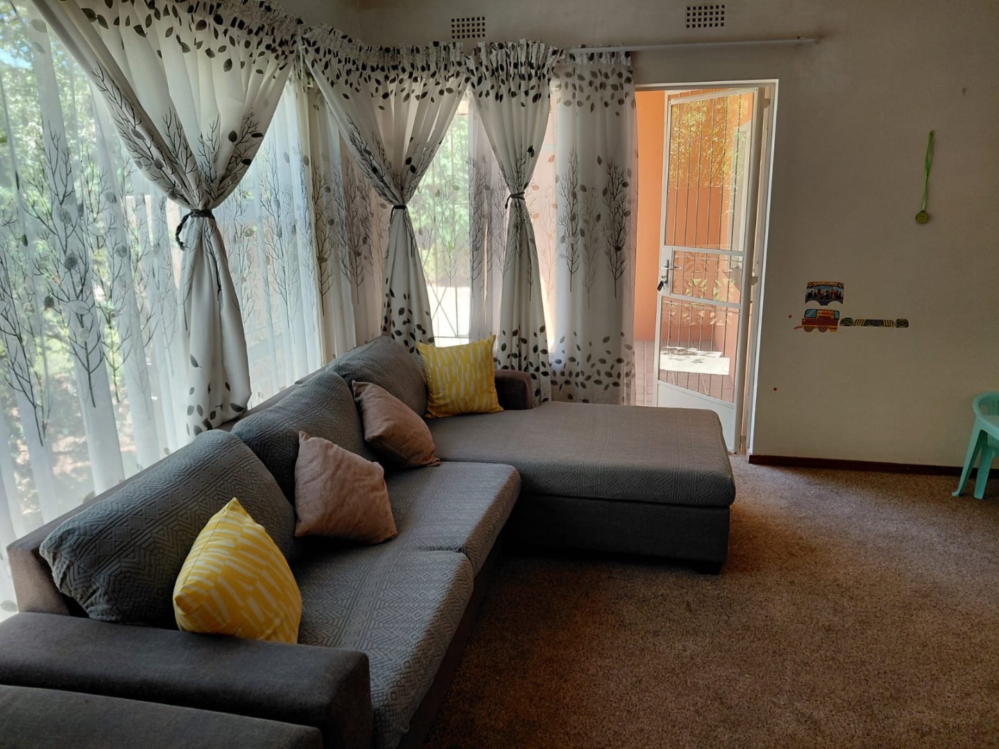 Outside, the property continues to impress with its lush garden areas, perfect for relaxation and outdoor activities. Security is well-addressed with security bars on windows and doors, and a security gate providing peace of mind for outdoor access. Pets are allowed, making this an ideal home for animal lovers.