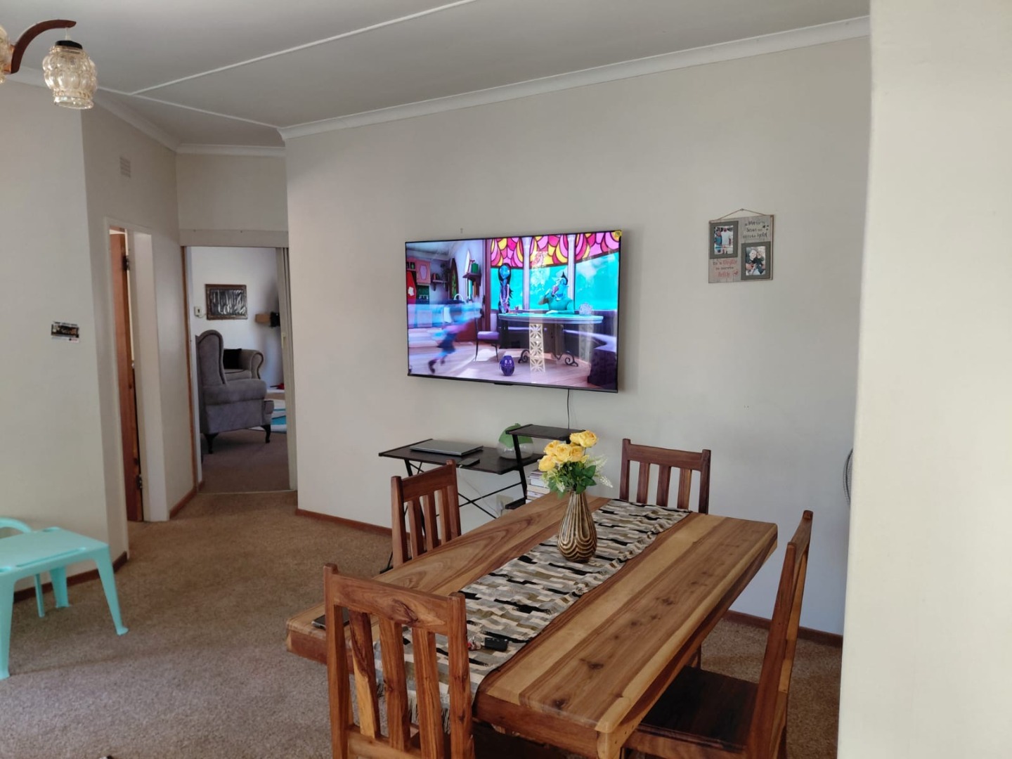 Step inside to find a thoughtfully laid-out interior designed for comfortable living. The property offers an open-plan flow between the dining and living areas, creating an inviting atmosphere for family gatherings and entertaining. A spacious living room features large windows that flood the space with natural light, alongside direct access to the outdoor area.